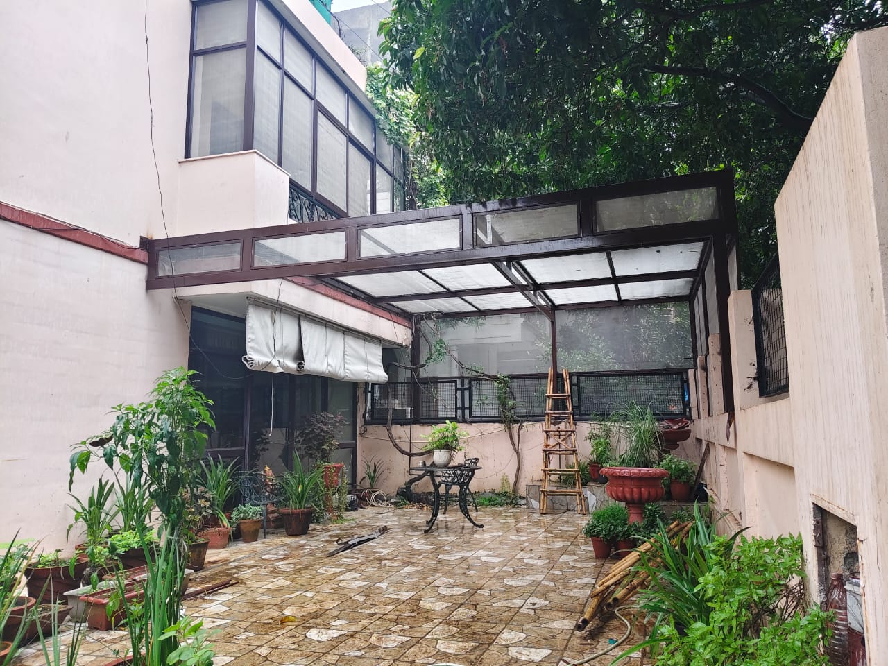 The roof has open slats that allow sunlight to filter through, creating a relaxing and aesthetic experience. One of the side walls also has vertical slats that ensure both partial privacy and ventilation. Flooring: The flooring uses a dark wooden textured deck platform that is slightly elevated above the roof, making this zone look different and special.